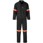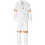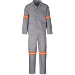 190g/m2 polycotton twill jacket: open neck collar • front yoke panel • concealed zip monza style chest pocket • two side pockets pants: elasticated back waist • five belt loops • two slanted front pockets • back pocket the suit size is based on the size of the jacket orange/silver 50mm reflective tape detail on arms, legs, and back day/night visibility