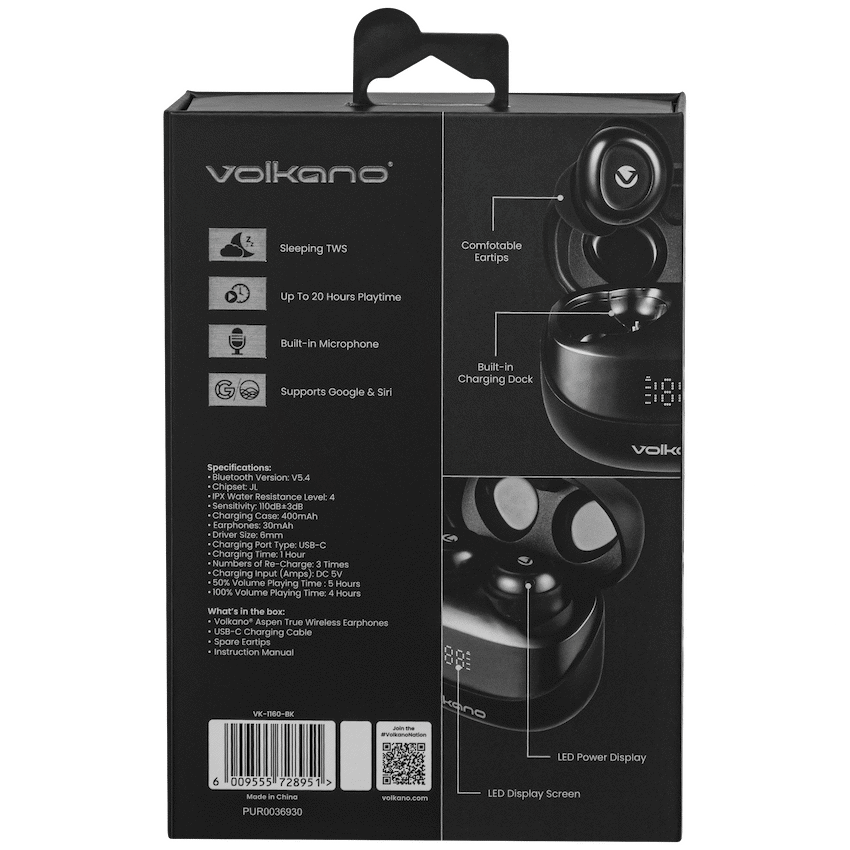 Unwind, power through workouts, or stay hands-free on the go with the Volkano Aspen True Wireless Sleeping TWS Earphones, purpose-built for comfort and performance. Ideal for those seeking Bluetooth earphones with voice assistant support and all-day battery life, these compact buds deliver a snug, lightweight fit that even makes them suitable for bedtime use.With compatibility for Google Assistant and Siri, a responsive built-in mic, and IPX4 water resistance, the Aspen series is designed for every moment-rain or shine, gym or commute. You’ll get up to 20 hours of total playtime, with the sleek charging case providing three full recharges.For anyone looking for water-resistant wireless earbuds that combine clarity, comfort, and smart features, Aspen is a smart, budget-conscious choice.