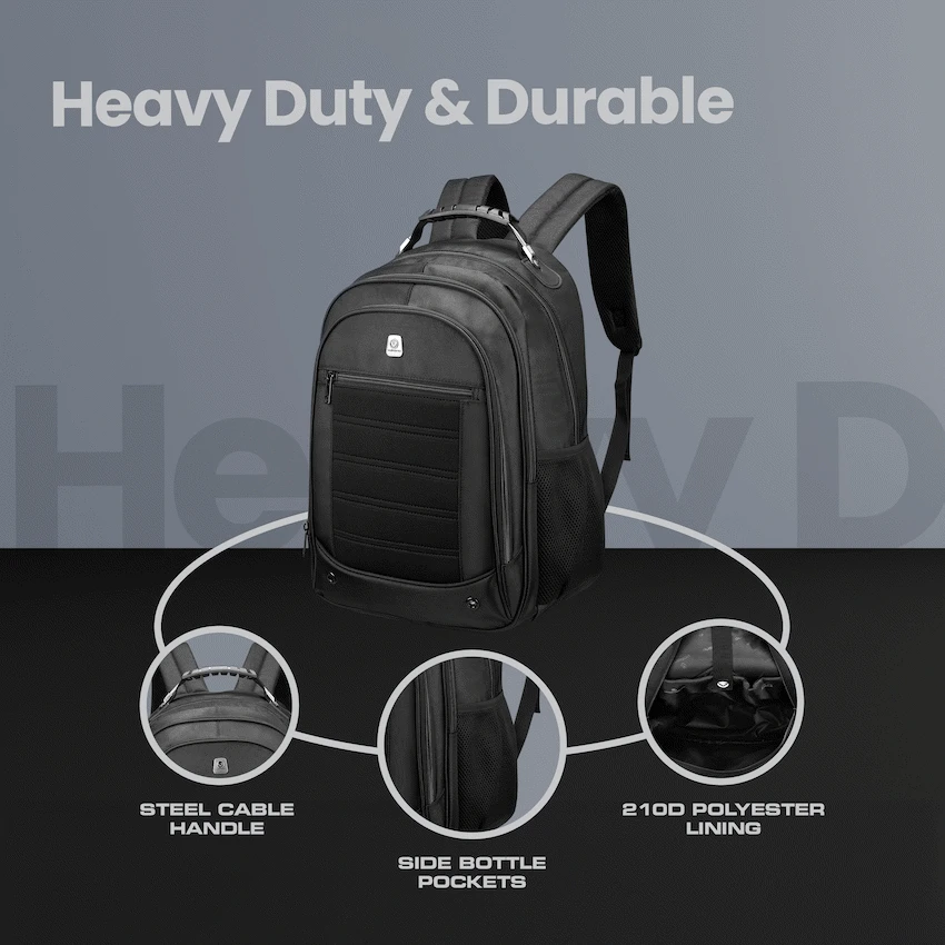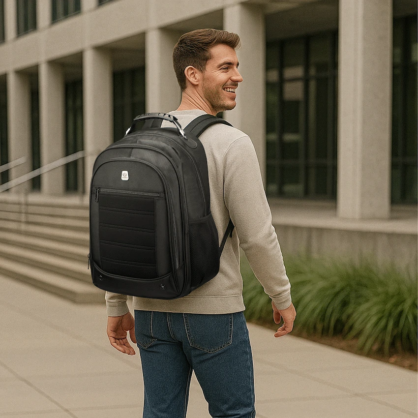 A high-quality laptop backpack with a padded compartment that fits laptops up to 15.6″. Multiple internal and external pockets provide ample storage for organizing chargers, cables, power banks, keys, wallets, water bottles, notebooks, documents, and other daily essentials. Made with durable, water-resistant materials and reinforced stitching for long-lasting use. Features adjustable padded shoulder straps, breathable back padding, a top handle for carrying, side handles for easy lift, and a secure zipper closure for added protection during travel or daily use.