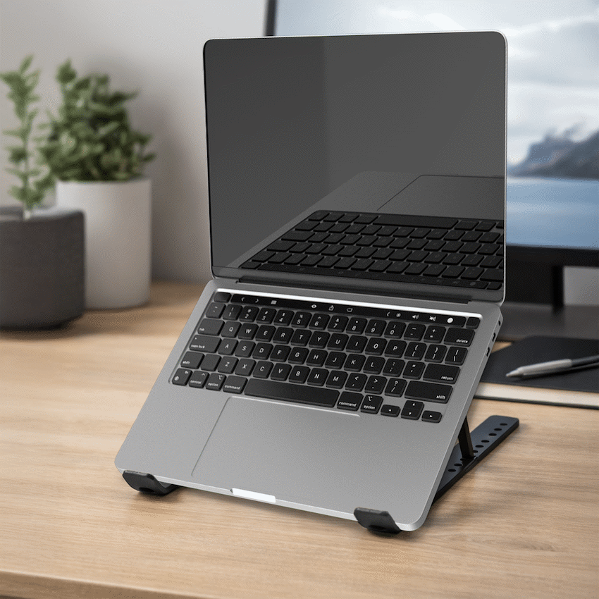 Work more comfortably with the Volkano Chill Series Aluminium Folding Laptop Stand (VK?8147?BK). This sleek, anodised aluminium notebook stand lifts your laptop for better posture-helping reduce neck and shoulder strain-and improves ventilation to prevent overheating. It’s foldable, portable and ideal for use at home, the office, cafes or on the go.Designed for flexibility, it offers angle adjustments between 15deg and 40deg, allowing you to set the screen to a height that suits your eyesight. When not in use, it folds flat to a compact size (??44?x?13?x?253 mm), so it fits easily in your laptop bag. Includes non?slip pads to hold your gear securely and a soft velour carry pouch for protection and easy transport.