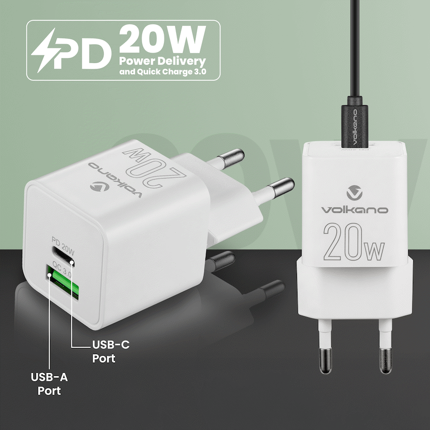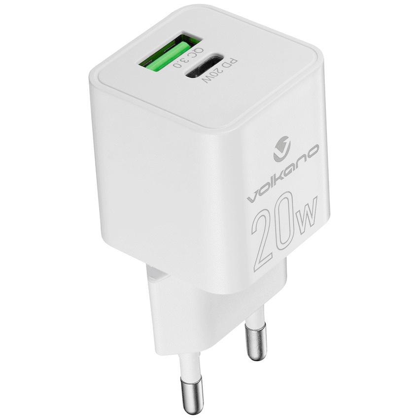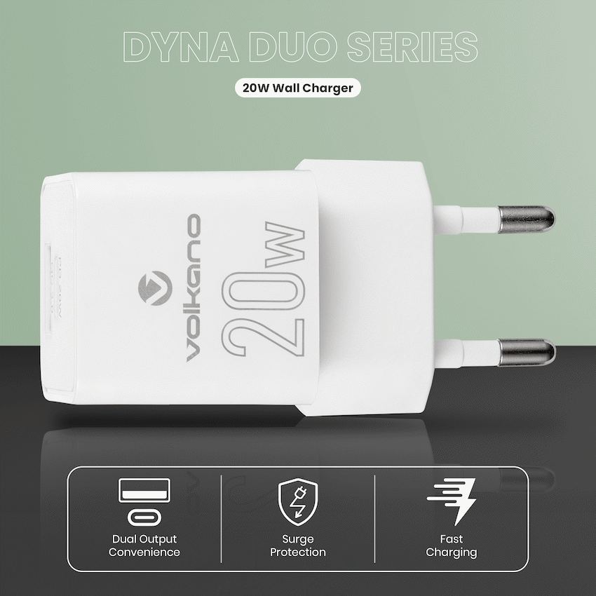 Need a reliable 20W fast charger that keeps up with your day? The Volkano Dyna Duo delivers serious speed in a compact wall plug, combining USB-C Power Delivery for the latest phones and tablets with Quick Charge 3.0 support for compatible Android devices. Plug in, power up, and get back to what matters-without being stuck at a wall socket.Charge your iPhone or USB-C device at up to 20W via PD for rapid top-ups, or use the USB-A port with QC 3.0 for efficient, optimised charging on supported devices. With two ports on one plug, you can power a phone and another gadget at the same time-perfect for busy households, workspaces, or packing light for weekends away. Thoughtfully designed for everyday use, it’s a no-fuss essential that plays nicely with your existing USB-C and USB-A cables.Whether you’re catching a quick boost before heading out, or keeping your tech ready on the go, Dyna Duo makes fast charging simple and dependable.