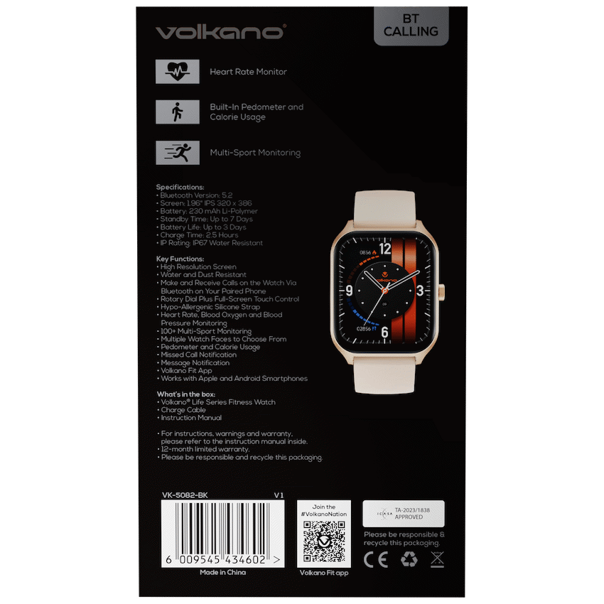 Stay connected and in control with the Volkano Life Series Bluetooth Call Smart Watch, made for modern lifestyles in South Africa. Whether you’re at work, training, or on the move, this feature-packed smart watch lets you make and receive calls directly from your wrist when paired with your smartphone-no need to reach for your phone.With an IP67 water and dust resistant design, it handles sweat, splashes, and dust with ease-ideal for workouts and everyday wear. Its high-resolution full-touch display with rotary dial makes navigation smooth and intuitive, while multiple watch faces let you personalise your look.Track your well-being in real time with heart rate, blood oxygen, and blood pressure monitoring, and stay motivated with over 100 multi-sport modes for running, cycling, yoga, and more. You’ll also receive message and missed call notifications, helping you stay informed on the go.Comfort meets function with a hypo-allergenic silicone strap, and the watch pairs easily with both Android and Apple devices via the Volkano Fit App for easy syncing and fitness tracking.