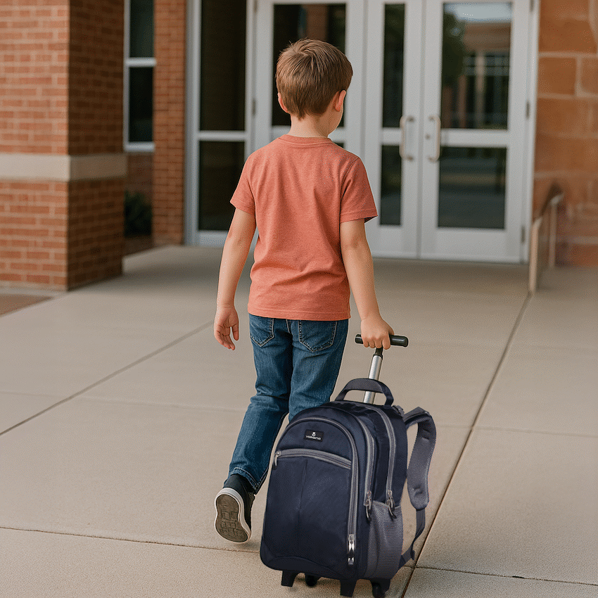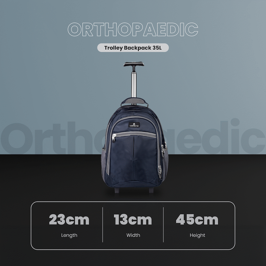 This orthopaedic, trolley backpack offers the convenience of two bags in one, combining the easy mobility of a trolley case with the versatility of a backpack. Equipped with smooth-rolling wheels and a sturdy extendable handle, it glides effortlessly through airports, stations, or city streets, reducing strain during travel. When needed, padded shoulder straps allow it to be worn comfortably as a backpack, providing flexibility for different situations. The spacious main compartment and multiple pockets ensure organized storage for books, laptops, clothes, or daily essentials, making it ideal for students, professionals, or travellers. Crafted from durable, high-quality materials with reinforced stitching, this trolley backpack is designed to be strong, practical, and reliable for everyday use or longer trips.
