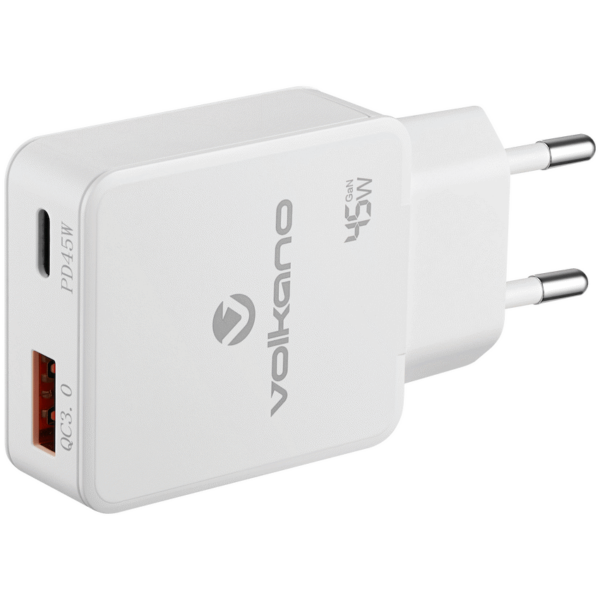 Meet the Volkano Potent Plus Series 45W GaN Compact Wall Charger – a next-generation charging solution designed for speed, efficiency, and portability. Featuring cutting-edge GaN (Gallium Nitride) technology, this compact powerhouse delivers up to 45W of high-speed charging through its USB-C Power Delivery port and USB-A Quick Charge port. Whether you’re topping up a smartphone, tablet, or lightweight laptop, this sleek dual-port charger offers smart power distribution, travel-ready versatility, and reliable performance in a remarkably small form factor.