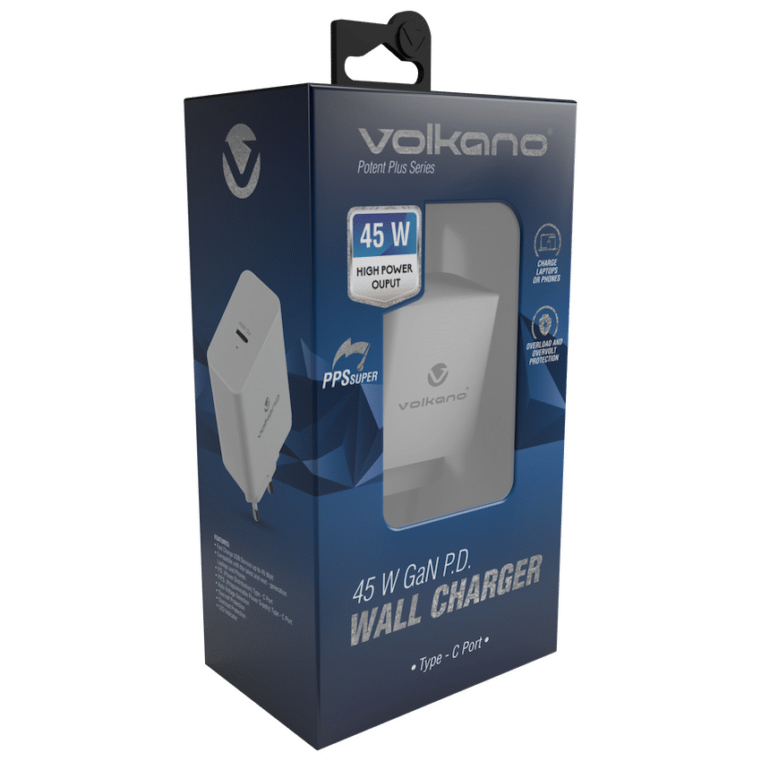 The Volkano 45W Compact PD Wall Charger is part of the Potent Plus series, which is designed to deliver fast and efficient charging for your devices. This charger features a compact and sleek design, making it easy to carry around wherever you go. It is also equipped with Power Delivery (PD) technology, which allows it to charge compatible devices at up to 45W.One of the standout features of the Volkano 45W Compact PD Wall Charger is its built-in safety features. It includes over-voltage, over-current, and short-circuit protection, which ensures that your devices are safe from any electrical damage while charging. The Volkano 45W Compact PD Wall Charger is a reliable and efficient charging solution that is perfect for anyone on the go. With its compact design, fast charging capabilities, and advanced safety features, it is a must-have accessory for all your electronic devices.Specifications:- 45W- Can Charge Laptops or Phones- Overload and Overvolt Protection- Type-C Port- Fast Charging- Colour: WhiteWhat’s in the box1 x Volkano 45W Compact PD Wall Charger | Potent Plus series1 x Type-C Charge Cable