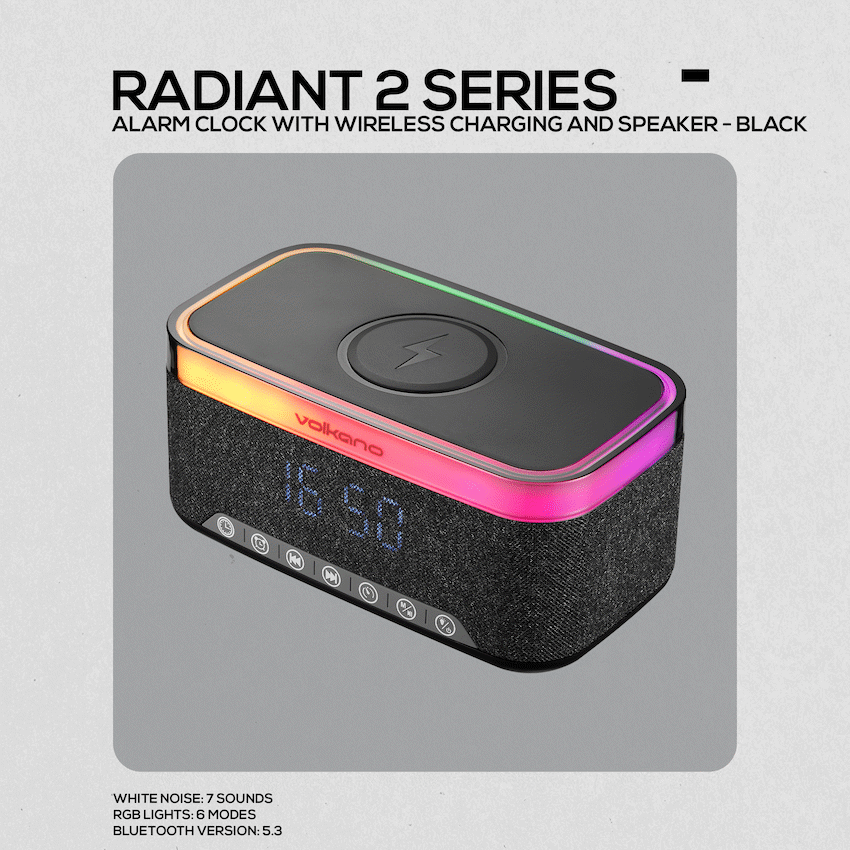 Wake up in style and stay connected with the Volkano Radiant 2 Alarm Clock Bluetooth Speaker with Wireless Charging. Combining modern convenience with powerful sound, this multifunctional bedside companion is designed to simplify your lifestyle.Enjoy 10W RMS (15W peak) audio output with Bluetooth playback, FM radio, AUX, USB, or Micro SD card inputs. Pair two units with True Wireless Stereo (TWS) for an even bigger sound experience. With up to 8 hours of playtime on a single charge, it’s perfect for both day and night use.The integrated 15W wireless charging pad keeps your compatible smartphone powered while you rest, while the alarm clock function ensures you never oversleep. Choose between 12/24-hour formats and set the mood with 12 RGB light modes. For a restful night, drift off with 7 white noise sounds and an adjustable 15/30/60-minute timer.Designed for style and function, the Radiant 2 is the perfect all-in-one solution for your bedroom, office, or living space.