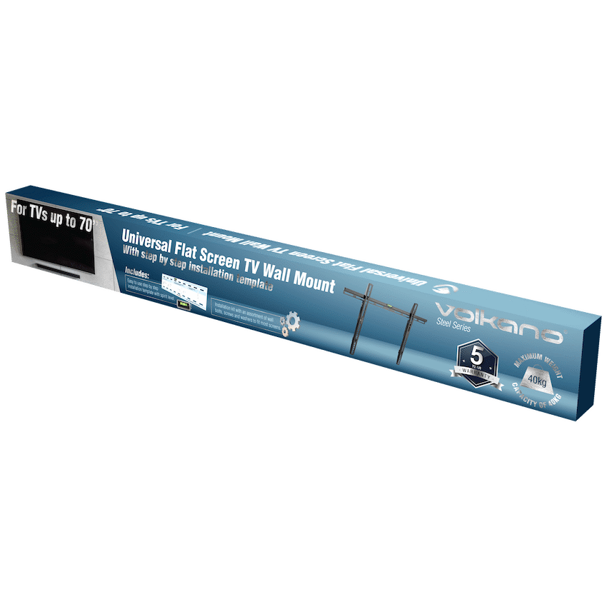 Elevate your home theater with the Volkano Steel Series 37-70-inch Flat TV Wall Mount in sleek black. Designed for those who appreciate both style and immersive viewing, this wall mount transforms your living space into a cinematic haven. With a minimalist design and durable steel construction, it accommodates TVs from 37 to 70 inches, effortlessly blending with your decor while freeing up valuable floor space.Experience the thrill of a clutter-free environment as your TV floats seamlessly on the wall, creating a sophisticated focal point. The black finish adds a touch of modern elegance, enhancing the overall aesthetic. Easy installation, guided by step-by-step instructions and all necessary hardware, ensures a secure foundation for your TV, allowing you to indulge in a premier home theater experience. Embrace the perfect fusion of form and function with the Volkano Steel Series Wall Mount, where every movie night feels like an exclusive event.Features:Steel Series TV Wall Mount Flat37~70 inchWhat’s in the box1 x Volkano TV Wall Mount1 x Instruction Manual
