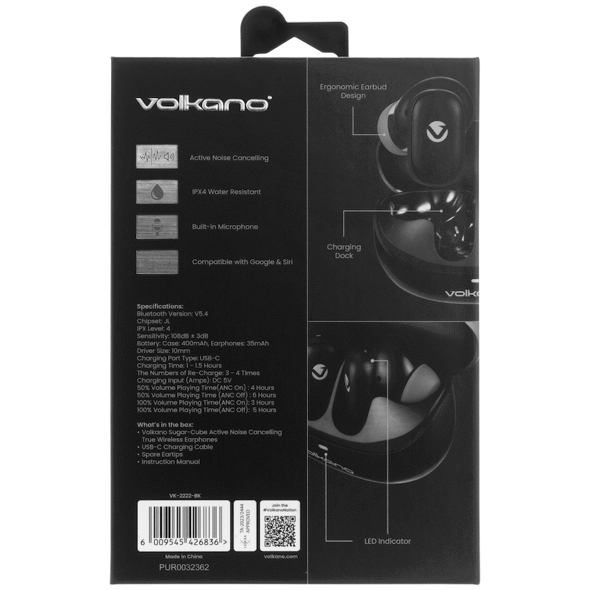 Enjoy immersive sound and total freedom with the Volkano Sugar-Cube Noise-Cancelling True Wireless Earphones. Designed for users on the move, these compact earbuds feature both Active and Environmental Noise Cancelling (ANC + ENC) to block out distractions and deliver crisp, uninterrupted audio-whether you’re commuting, working out, or just relaxing.Stay connected with voice assistant support using Google and Siri, and enjoy clear calls with the built-in mic. With IPX4 splash resistance, these earphones are ready for light rain or sweat, while the sleek charging case allows for up to 30 hours of total playback. The USB-C charging port ensures fast and modern charging convenience.Whether you’re looking for noise-cancelling wireless earbuds or splashproof ANC earphones, the Volkano Sugar-Cube delivers in style and performance.Feature Highlights:Active + Environmental Noise Cancelling – Reduces outside sounds for immersive listeningUp To 30 Hours Total Playtime – Rechargeable case delivers extended useVoice Assistant Ready – Seamless integration with Google and SiriBuilt-In Mic For Clear Calls – Enjoy crisp, hands-free conversationsSplash Resistant (IPX4) – Suitable for workouts and light outdoor useTechnical Specifications:Bluetooth Version: 5.4Chipset: JL7003D4Driver Size: 10mmSensitivity: 108dB +/- 3dBEarbud Battery: 35mAh eachCharging Case Battery: 400mAhCharging Time: 1-1.5 HoursCharging Port Type: USB-CRecharge Cycles: 3-4 times per full casePlaytime (ANC On): Up to 4 Hours at 50% VolumePlaytime (ANC Off): Up to 6 Hours at 50% VolumeWhat’s in the Box:Volkano Sugar-Cube Active Noise Cancelling True Wireless EarphonesUSB-C Charging CableSpare Ear tipsInstruction ManualTake your sound further with compact design, smart features, and noise control that keeps you in the zone.
