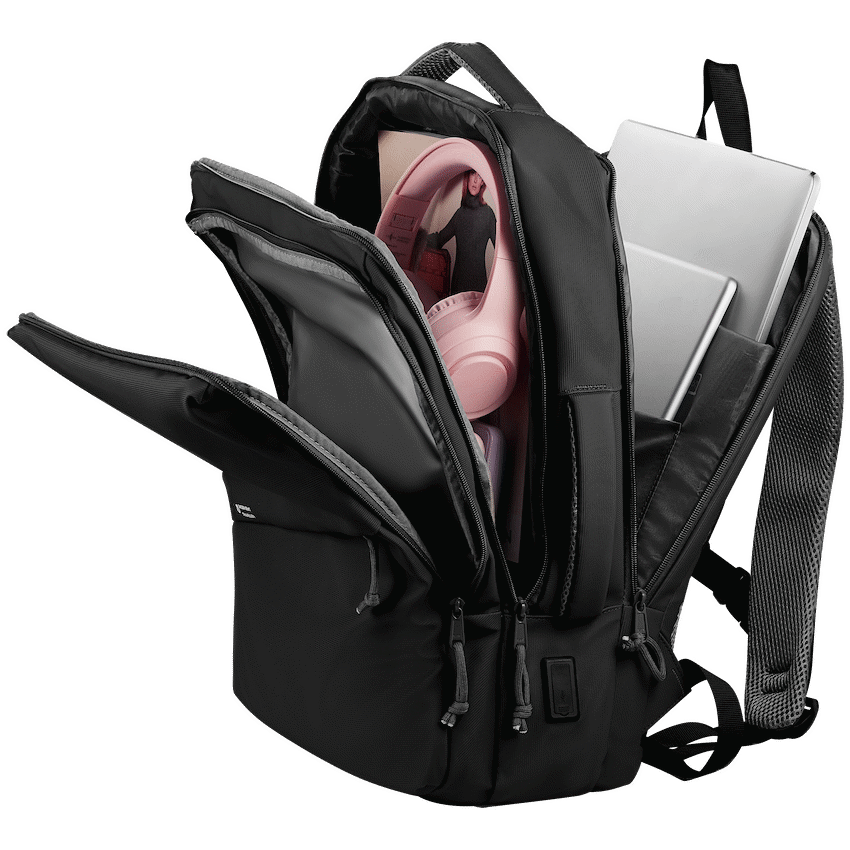 A high-quality laptop backpack with a padded compartment that fits laptops up to 15.6″, designed to accommodate all your business and overnight packing needs, whilst fitting neatly under the seat in front of you on an aeroplane. Multiple internal and external pockets provide ample storage for organizing chargers, cables, power banks, keys, wallets, water bottles, notebooks, documents, and other daily essentials. Made with durable, water-resistant materials and reinforced stitching for long-lasting use. Features adjustable padded shoulder straps, breathable back padding, a top handle for carrying, side handles for easy lift, and a secure zipper closure for added protection during travel or daily use.