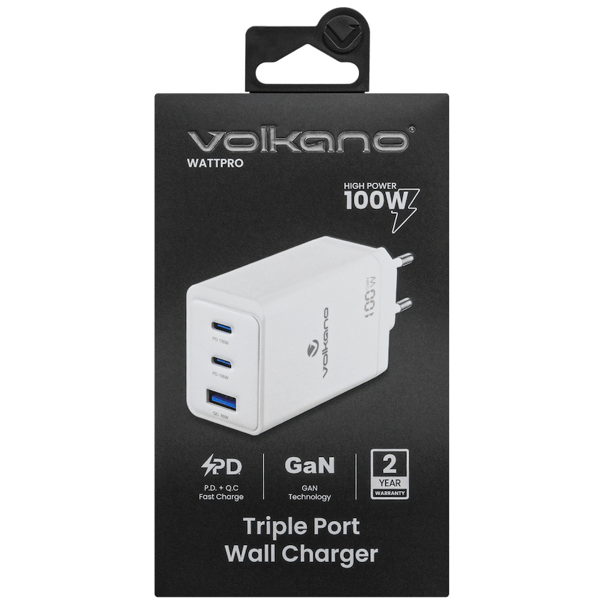 Experience next-generation charging with the Volkano WattPro Series Dual 100W Wall Charger – your ultimate power companion at home, in the office, or on the go. Engineered with cutting-edge Power Delivery (PD) and PPS technology, this premium charger delivers up to 100W of fast, intelligent charging through dual USB-C ports and a high-powered USB-A port. Whether you’re powering laptops, smartphones, tablets, or gaming devices, the WattPro ensures rapid and reliable performance every time.