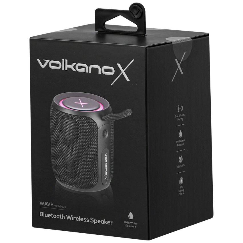 Enjoy rich, immersive sound anywhere with the Volkano X Wave IPX66 Bluetooth Speaker, your go-to companion for outdoor adventures and everyday music moments. Whether you’re heading to the beach, camping, or chilling at home, this waterproof Bluetooth speaker is built to handle it all with bold sound and rugged design.Delivering 12W RMS output through dual drivers, the Wave Series balances crisp treble with punchy bass in a compact, stylish form. With up to 10 hours of playtime, RGB lighting effects, and True Wireless Stereo (TWS) pairing, you can link two units for an even more immersive audio experience. The compact size makes it easy to carry, while the IPX66 rating protects it from dust, splashes, and heavy rain.Perfect for those looking for a portable Bluetooth speaker with lights, bass, and durability, the Wave is ideal for both party settings and solo sessions.