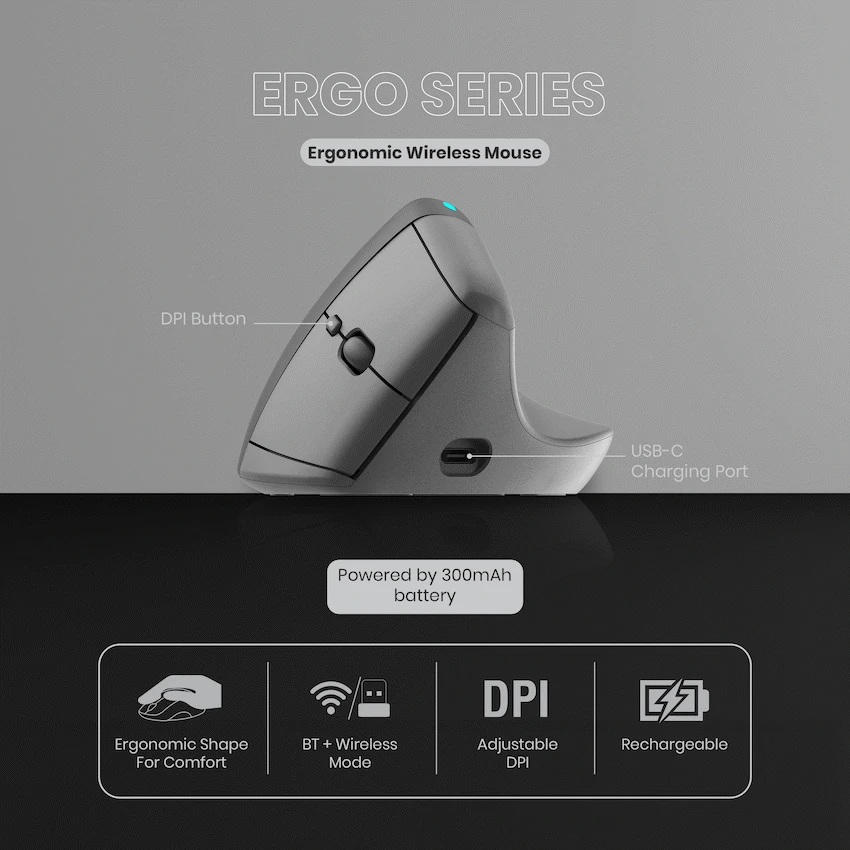 Say goodbye to wrist discomfort with the VolkanoX Ergo Bluetooth Wireless Mouse, designed with a vertical, natural-hand-position grip that promotes better posture and reduces strain during extended use. You can switch effortlessly between Bluetooth and 2.4 GHz wireless connectivity, giving you flexibility whether you’re working on a laptop, tablet, or PC.Enjoy smooth performance with adjustable DPI levels for precise cursor control across different tasks. The mouse also features silent buttons, ensuring quiet, distraction-free clicking. Thanks to its USB-C rechargeable battery, you can enjoy up to six months of use on a single charge1, minimizing downtime and keeping your workspace clutter-free. It delivers universal compatibility across Windows, macOS, and Linux, wrapped in a sleek, ergonomic design for all-day comfort.