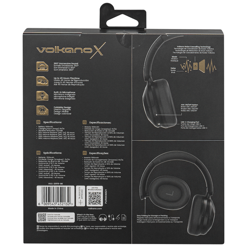 Block out distractions and tune into what matters with the VolkanoX Halo Series ANC Bluetooth Headphones. Designed for comfort and clarity, these ANC Bluetooth headphones let you enjoy your music, podcasts, or calls without the noise of the outside world. Whether you’re commuting, working, or relaxing, the Halo delivers crisp audio and long-lasting performance in a sleek, travel-ready design.Enjoy uninterrupted listening with up to 45 hours of battery life and fast USB-C charging for minimal downtime. The built-in microphone ensures clear, hands-free calling, while the 40mm drivers deliver powerful, balanced sound. With Bluetooth 6.0 and support for advanced codecs like LDAC and AAC, you’re guaranteed a stable connection and premium wireless audio.Perfect for work, travel, or downtime, these lightweight, foldable headphones are built for modern lifestyles.Feature Highlights:Active Noise Cancelling (ANC) – Eliminate background noise for focused listeningUp To 45 Hours Playtime – Enjoy extended listening without constant rechargingCrystal-Clear Calls – Built-in mic ensures reliable, hands-free conversationsHigh-Quality Sound – 40mm drivers with support for LDAC and AAC audio codecsCompact & Travel-Friendly – Lightweight design fits easily in bags and luggageStable Wireless Connection – Bluetooth 6.0 for reliable pairing and low-latency audioTechnical Specifications:Bluetooth Version: 6.0Chipset: JL7018FProfile: HSP,HFP ,A2DP,AVRCP,SBC?AACBluetooth Distance: ?10mImpedance: 32?Frequency Range: 2.402-2.480GHZSensitivity:112dB (+/-5dB) at 1KHzNoise Reduction: 30+/-3dBBattery: 500mAhDriver Size: 40mmCharging Port: USB-CCharging Time: 4 HoursCharging Input (Amps):5 V/1A50% Volume Playtime (ANC On): 35 Hours50% Volume Playtime (ANC Off): 45 Hours100% Volume Playtime (ANC On): 30 Hours100% Volume Playtime (ANC Off): 40 HoursWhat’s in the Box:VolkanoX Halo ANC Bluetooth HeadphonesUSB-C Charging CableAux CableInstruction ManualStay connected, focused, and immersed-wherever life takes you.