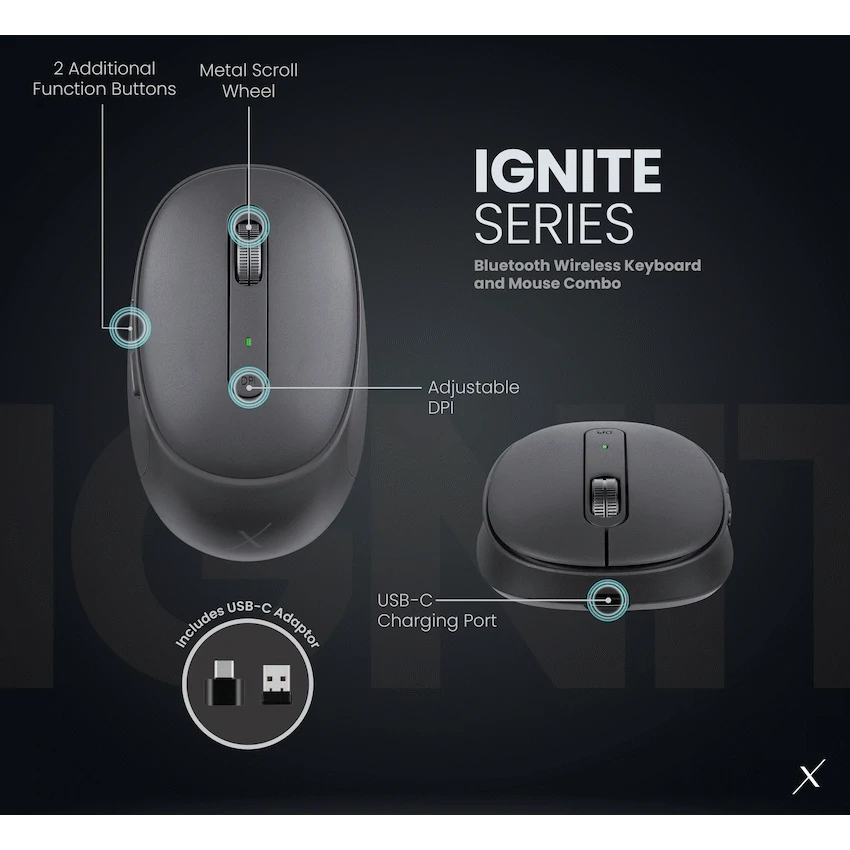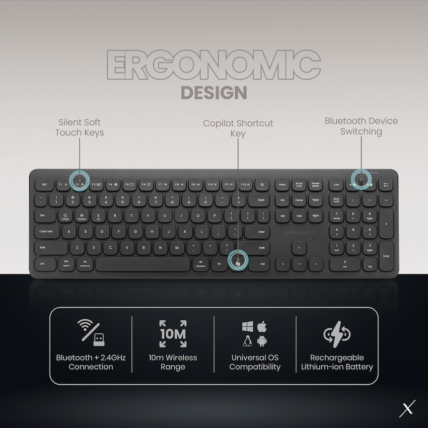 Enjoy a cleaner desk and smoother productivity with the VolkanoX Ignite Bluetooth Wireless Keyboard & Mouse Combo. This premium set gives you the best of both worlds: seamless connection via Bluetooth or 2.4?GHz wireless, and soft?touch keys & buttons to keep things quiet. With the keyboard and mouse built to be rechargeable, you get long battery life (up to ~6 months under normal use), great ergonomics, and full compatibility across Windows, macOS and other OSes.The Ignite combo is made for people who type, click and move between workstations often: adjustable mouse sensitivity, silent key strokes with subtle feedback, comfortable layout, and reliable wireless range make it ideal for home, office or on the go. Finish it off with a modern graphite look and dependable build quality with a 3?year limited warranty-and you’ve got a combo made to last.