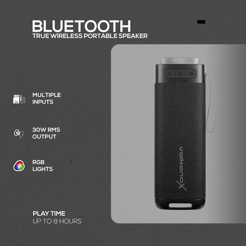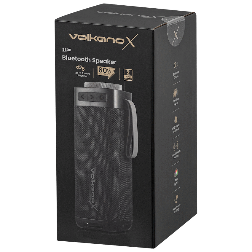 Take your music anywhere with the VolkanoX S500 Portable Bluetooth Speaker-built for powerful sound and modern convenience. With 30W RMS output (60W peak power), this portable speaker delivers room-filling audio with deep bass, perfect for parties, outdoor gatherings, or everyday use.Enjoy up to 8 hours of playtime at 50% volume and recharge in just 3 hours via USB-C. Add extra energy to your music with RGB lighting effects, and connect two speakers wirelessly with True Wireless Stereo (TWS) pairing for an even bigger soundstage.This speaker doesn’t just look and sound great-it’s also IPX5 water-resistant, making it ideal for outdoor adventures. Play music your way with multiple input options: Bluetooth, AUX, TF card, and USB, while the built-in mic and voice assistant support keep you connected hands-free.For those who love control, the EQ function lets you fine-tune your audio to match your mood or environment.