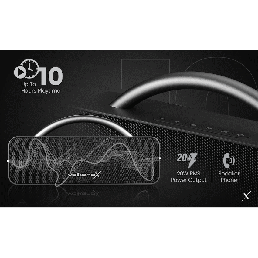 SPECIFICATIONS: Bluetooth Version: 5.1 Chip Set: JL Profiles: HFP / A2DP / AVRCP Operating Distance: 10 m Frequency Response: 80Hz – 16kHz Battery Capacity: 1800mAh Charge Time: 3 Hours Playback Time: Up to 10 Hours Power Requirement: 5 V DC , 2 A Sensitivity: 88dB Impendence: 3 Ohm 20W RMS OutputFEATURES AND BENEFITS: Up to 10 Hour Playback IPX level: IPX5What’s in the box1 x Volkano X VXS200 Portable Bluetooth Speaker