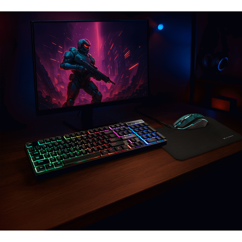 With 3 totally awesome components, The VX Gaming Artemis Gaming Combo is here to add value, aesthetic appeal and edge to your gaming experience. The Artemis Keyboard features 12 Keyboard Shortcut Keys and multi-coloured lighting on a membrane keyboard. The mouse also features rainbow colours and DPI up to 3200.Special Features:- 12 Keyboard Shortcut Keys- High Definition 3200 DPI Mouse- Multicolor Lighting- Non Slip Mouse padKeyboard:- Connection Method: USB- Illumination: Rainbow Color- Function Keys: 12- Multimedia Keys: 12- Key System: Membrane- Cable Length: 1.5 mMouse:- Rainbow Colour- Polling Rate: 125 Hz- DPI Switch: 1200 / 1600 / 2000 / 3200- Scrollwheel: Yes- Buttons: 6What’s in the box1 x Keyboard1 x Mouse1 x Mouse Pad