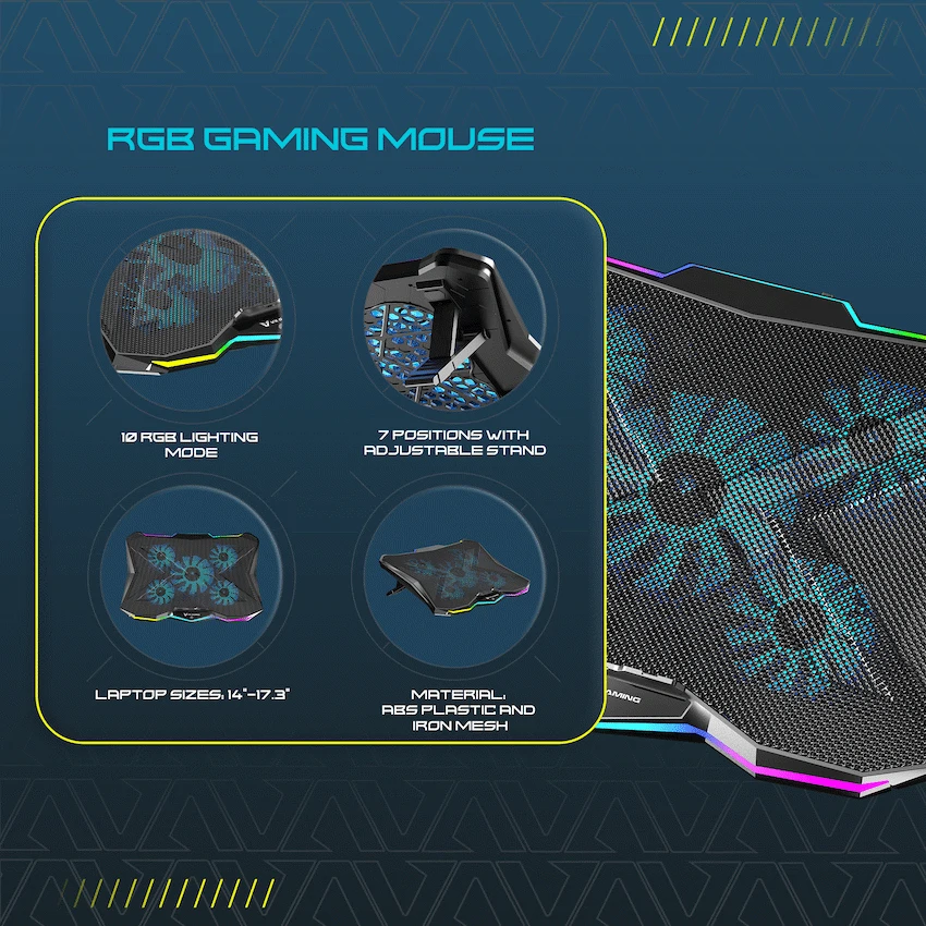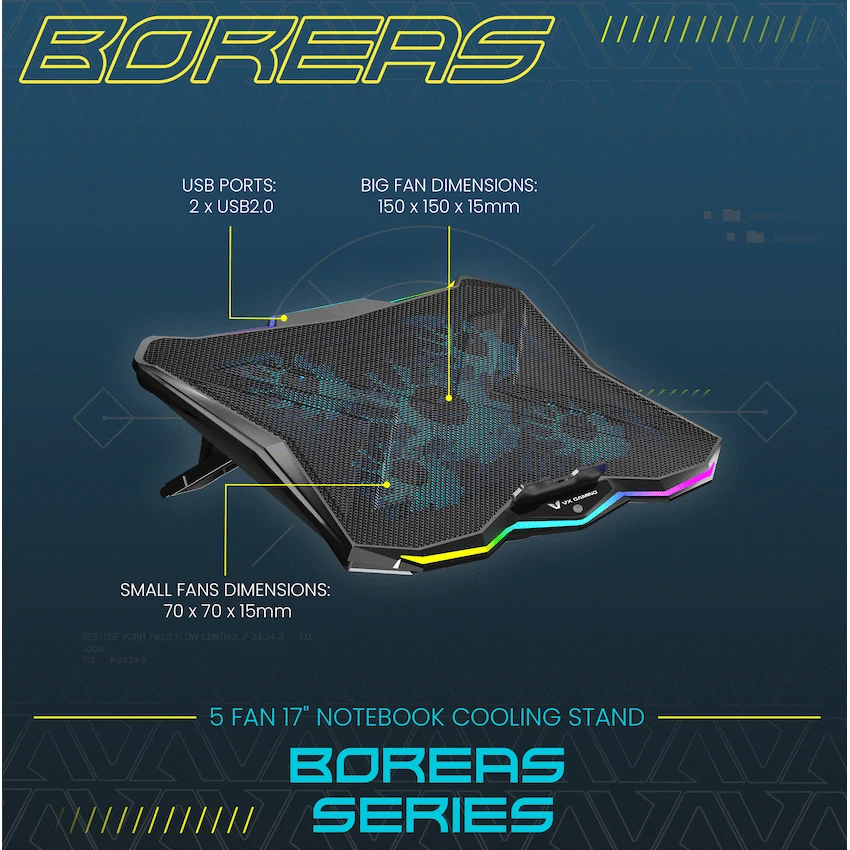 Push your laptop to perform at its best while keeping cool under pressure with the VX Gaming Boreas Series 5?Fan 17?inch Notebook Cooling Stand. Engineered for both gamers and creators, this stand delivers exceptional cooling via five powerful fans (one large + four smaller), while maintaining quiet operation. The 10?mode RGB lighting adds style, and a 7?position adjustable height setup ensures better posture and comfort for extended use.Ideal for notebooks between 14?17.3 inches, the Boreas stand is powered via USB (5V), includes two USB 2.0 ports for connectivity, and is built tough using ABS plastic and iron mesh. Whether you’re streaming, gaming or working all day, this is your solution for better airflow, reduced heat, and cleaner setups.